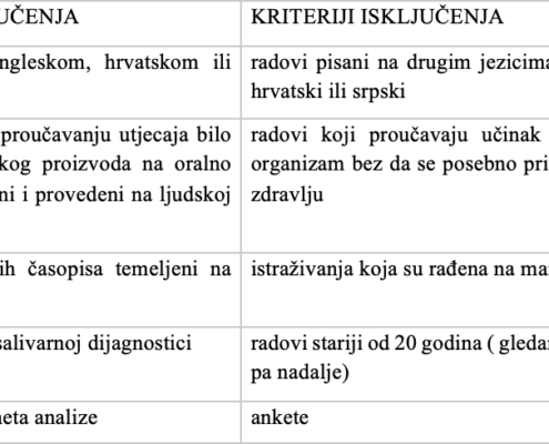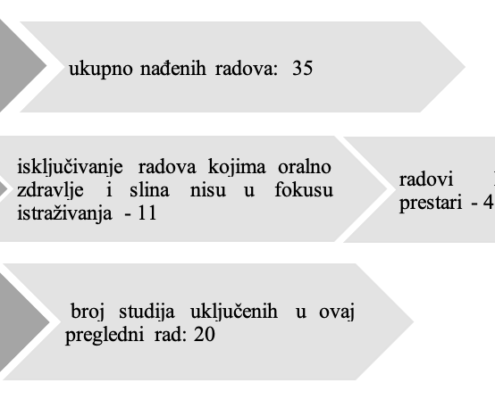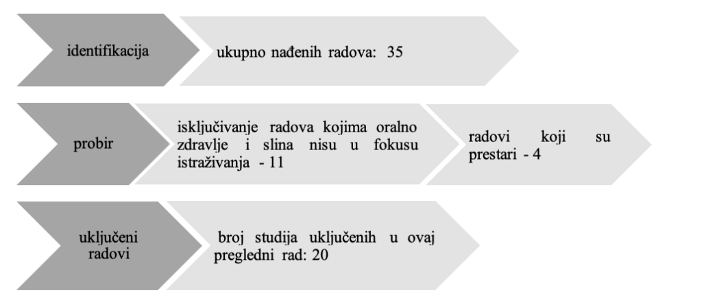 Pretraživanje je provedeno pomoću ključnih riječi i njihovih kombinacija: “electronic cigarettes and saliva”, “heated tobacco products and saliva”, “salivary flow rate”, “salivary pH”, “salivary composition” i “salivary diagnostics”. U pretraživanju nije korišten pojam “oralno zdravlje” kako bi se izbjeglo uključivanje radova koji se primarno bave oralnim lezijama i drugim patološkim promjenama koje nisu izravno povezane sa salivarnim parametrima.