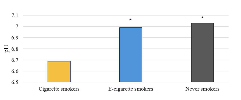 Drugo, vrlo slično istraživanje, od Hasana i sur. (2024) (4) pokazalo je da je pH ipak niži u pušača klasičnih cigareta, salivarni pH u pušača e-cigareta bio je 6,99 ± 0,29, u pušača klasičnih cigareta 6,69 ± 0,34, a u nepušača 7,03 ± 0,32 (Grafikon 1). Također, nije se pokazala znatnija razlika u pH vrijednosti pušača klasičnih cigareta i električnih cigareta.
