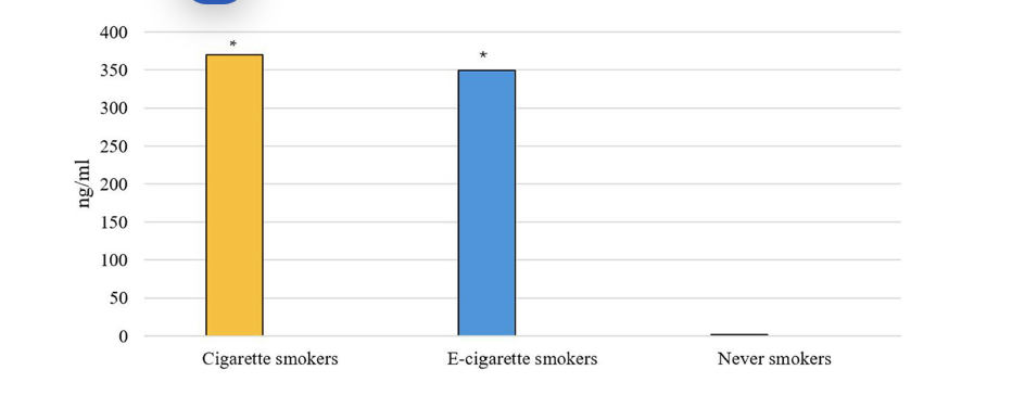 U slini pušača može se naći i kotinin, glavni metabolit nikotina koji se metabolizira putem enzima CYP2A6. Duži mu je životni vijek od nikotina i izlučuje se i u slini i mokraći. Njegova količina proporcionalna je nikotinu u duhanskim proizvodima, a pušači prema studiji Hasana i sur. (2024) imaju veću razinu kotinina u slini (4) (Grafikon 2).
