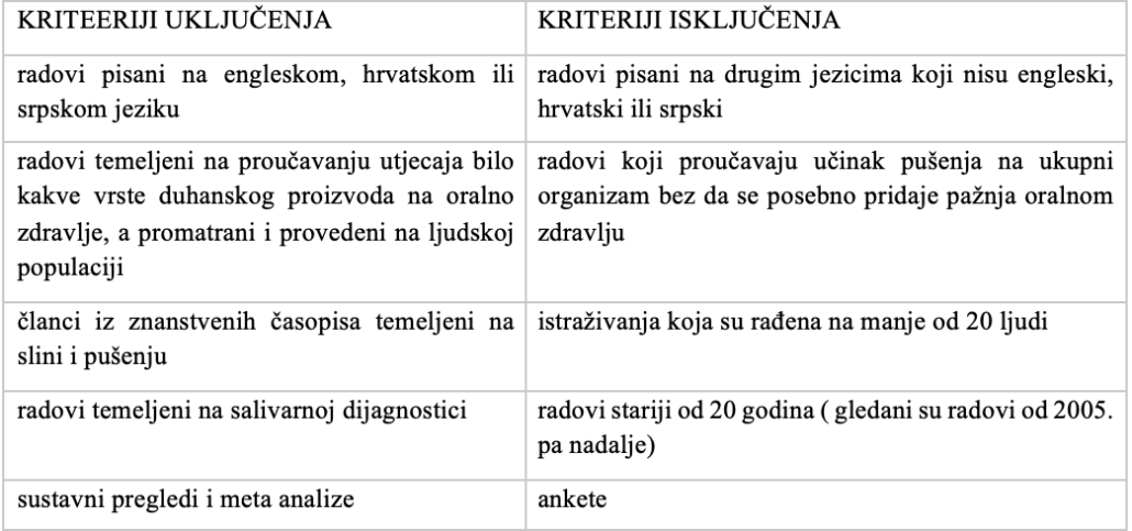 U pregled su uključeni radovi objavljeni na engleskom, hrvatskom i srpskom jeziku koji su se bavili utjecajem klasičnih cigareta, elektroničkih cigareta i proizvoda grijanog duhana na kvantitativne i kvalitativne parametre sline. Prednost je dana primarnim istraživanjima provedenima na ljudima, dok su pregledni i sustavni pregledi korišteni isključivo kao kontekst za interpretaciju nalaza.