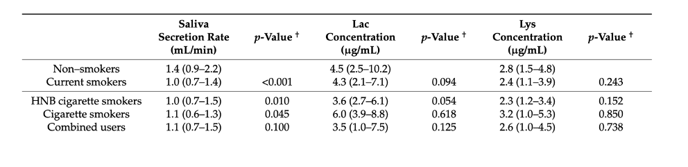 Time je dokazano da grijani duhan također utječe na kvalitetu i kvantitetu sline. Viskoznost sline se povećava, a ukupni protok sline se smanjuje. Razlog tome su utjecaji nikotina na protok krvi kroz žlijezdu i utjecaj štetnih tvari na žlijezde slinovnice. Ispitanici u istraživanju Sever i sur. (5) koji su pušili grijane duhanske proizvode imali su manju incidenciju halitoze nego u konvencionalnih pušaća što se objašnjava time da se u aerosolu grijanog duhana nalazi manje toksina koji bi uzrokovali neugodan zadah te da aerosol slabije smanjuje SFR nego klasične cigarete. što se tiče imunosne komponente sline, Mori i sur. (7) (2022) istraživali su efekt grijanog duhana na lučenje sline i njenu imunosnu komponentu, lizozim i laktoferin. Ispitanicima su koncentracije lizozima (Lys) i laktoferina (Lac) izmjerene pomoću ELISA testa (Tablica 9).